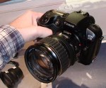The last booth I got to before things closed was the Canon one, where I finally got to fondle a Canon D-30 digital SLR. They are in such demand and short supply that the Canon people had to put their own units on display (I noticed the name sticker on the back of the camera matched one of the booth people). When I picked it up I asked if there was one to try -- this one didn't have a memory card in it. It turns out it was supposed to have a card -- booth "shrinkage" I guess. They took a storage card out of another cheaper camera and let me try it. Nice, but heavy with the big lens.