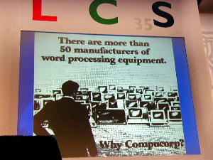 This slide, "Why Compucorp?", and early stand-alone word processor, prompted Bill to ask "Why, indeed?" when you can use a general purpose PC: