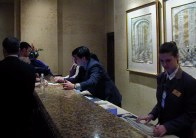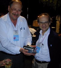 I shared a taxi from the airport to the hotel with Michael McCaskey, Chairman of the Board of the Chicago Bears football team. I told him about some of the sports related web sites our users are making. We remembered the Super Bowl between the New England Patriots and his team. He remembers it as a glorious game (it was for them). I remember the disappointment. He tells the story of the New England fans who yelled "We're number 1!!!" when the game first went New England's way, and then "We're number 2!!!" as the tide turned. Here he is at the check-in (it took a few tries for the check-in person to get the hang of my digital camera -- luckily you can check the results on the spot):