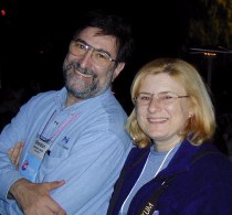 I found my friend Bob Frankston. Here he is with Yossi Vardi of ICQ who made Bob empty his pockets to show off all his gadgets (two cameras, a cell phone, a Visor, etc.). Here's also a picture of Esther:
