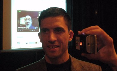 ![]() Philip DesAutels of Microsoft watches as Laura Fitton holds a Nokia N95 which is streaming video through Qik.com. The live feed is visible in a browser window in the background on the projection screen.