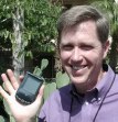 Jeff Hawkins of Handspring right after announcing the Treo in October 2001, pictures I took at that time comparing the size to other phones: Nokia 8260 (regular cell phone) and Kyocera QCP-6035 (Palm OS cell phone)
