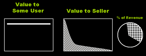 ![]() The horizontal axis is the range of things you'll want to do sorted by popularity. The vertical axis is the value to a particular purchaser. For the sake of argument, I'll assume that in general the value of each item is reflected in its popularity. For example, with PDAs, everybody wants a calendar application and an address/phone book. What I've added is the occasional item that is a "must have". These are of great value to the purchaser.