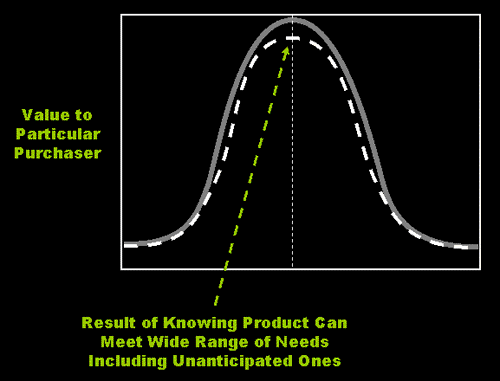 ![]() If I'm buying a system to meet this general area of need, how do different system architectures fit? Here are two types: One is a restricted, special purpose system that meets the popular needs quite well. It is of high value for those needs, but not for the others. The other is a general purpose system that I know will meet many, many more of my current and potential needs. It is of high value for a wider range. As David Reed says, general purpose gives you more options and in the right cases more higher valued options because they are for the right kinds of high value potential uses. Here's the graph: